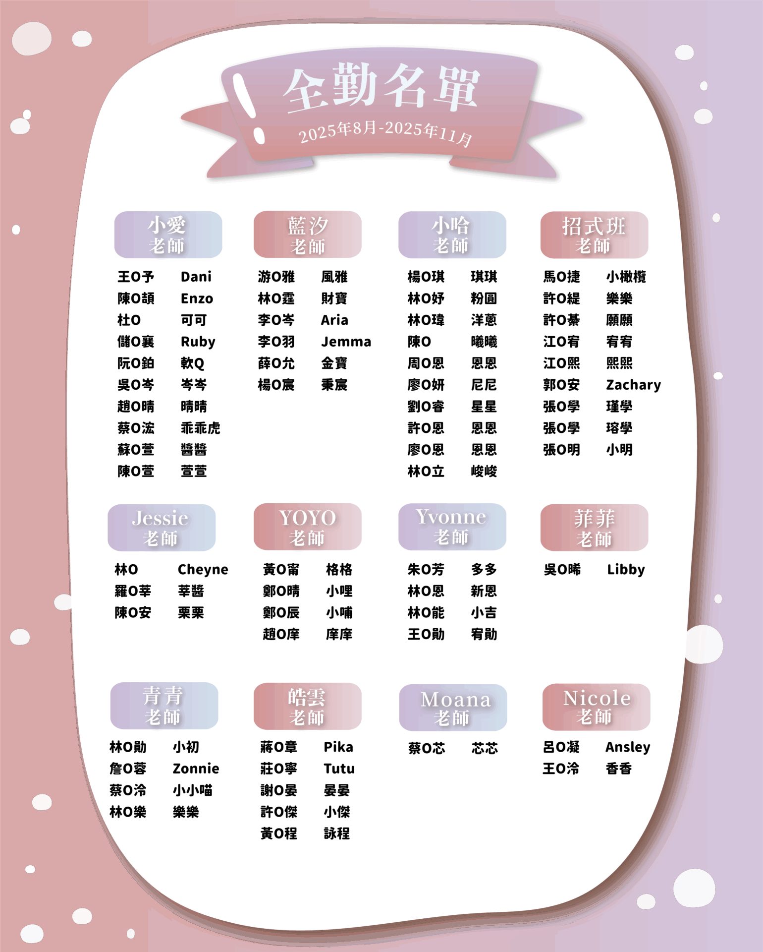 ✨2025 年 8–11 月【學期全勤名單出爐】🍀