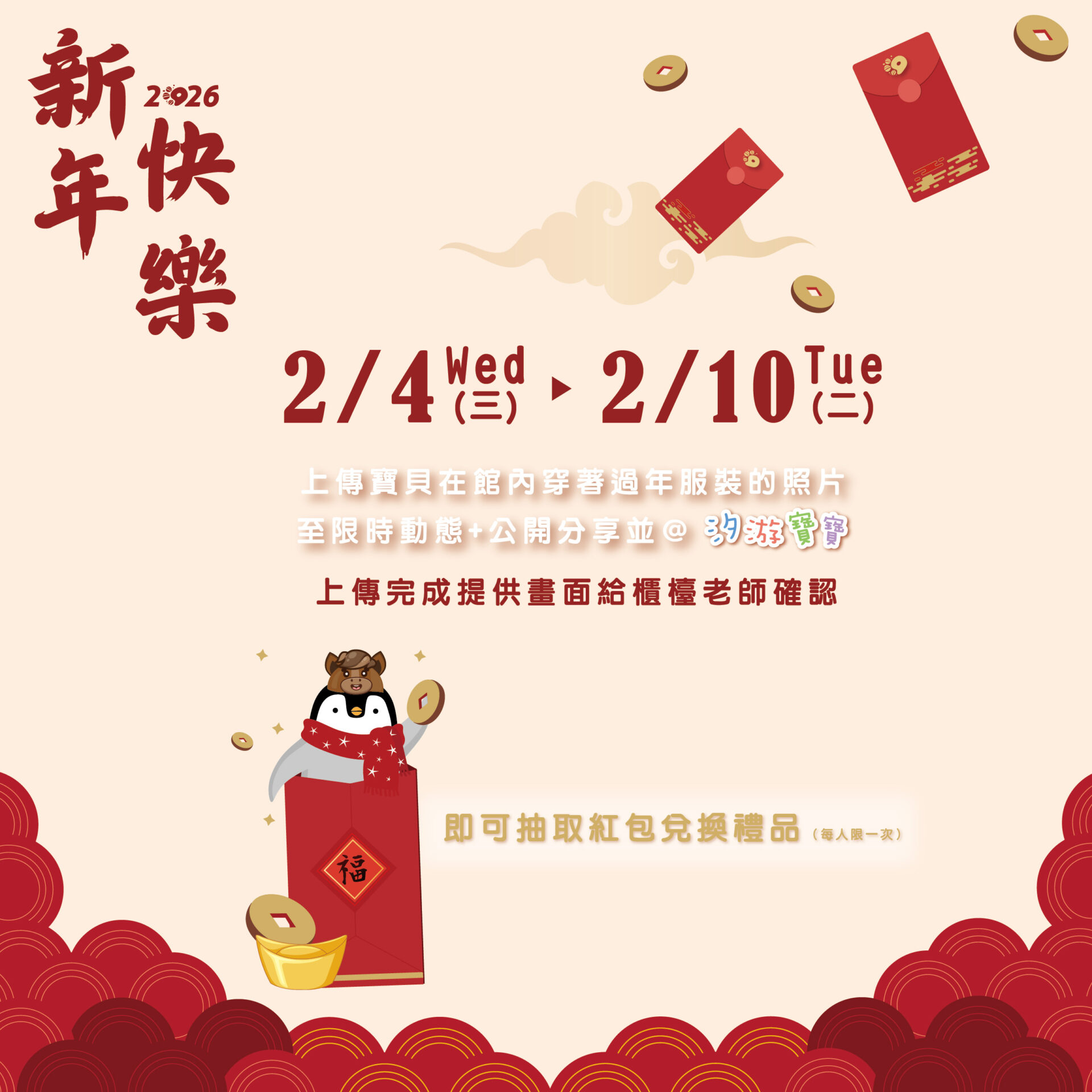 過年期間,帶寶貝來汐游寶寶,喜氣拍照就有機會把紅包帶回家 🥰